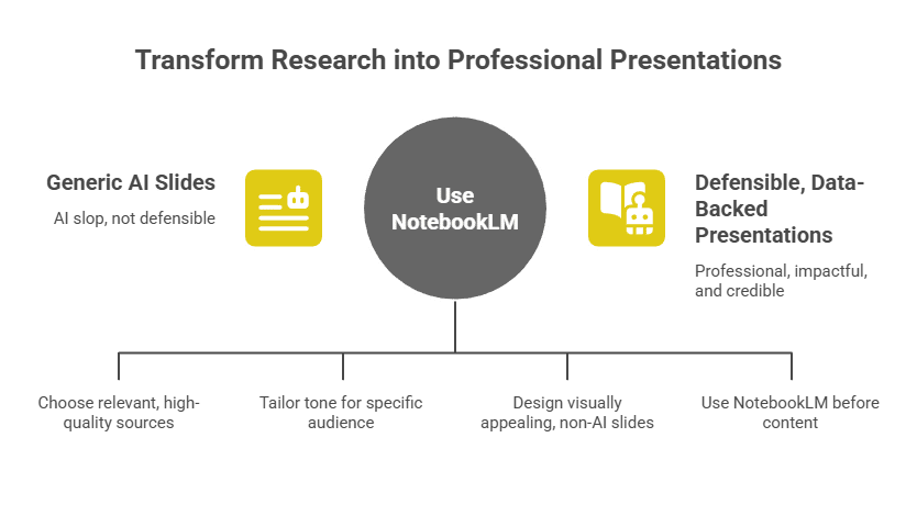 6. Turn Messy Research Into Professional PresentationsMost people use AI to generate generic slides that look like AI slop. This video shows how to use Google's NotebookLM as a deep research assistant to create defensible, data-backed presentations for corporate or marketing use. Key insights: